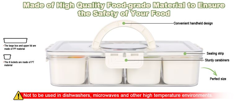 The storage box is made of food-grade plastic material, which is safe and non-toxic to ensure that the stored food will not be contaminated. At the same time, its durability also makes the separation box can be used for a long time, and is not easy to be damaged or deformed, giving you a lasting use experience. Snack storage compartments can effectively save storage space. Its stacked design allows multiple boxes to be stacked on top of each other, making it suitable for storage in various kitchen cabinets, refrigerators or desks, helping you stay clean and organized.